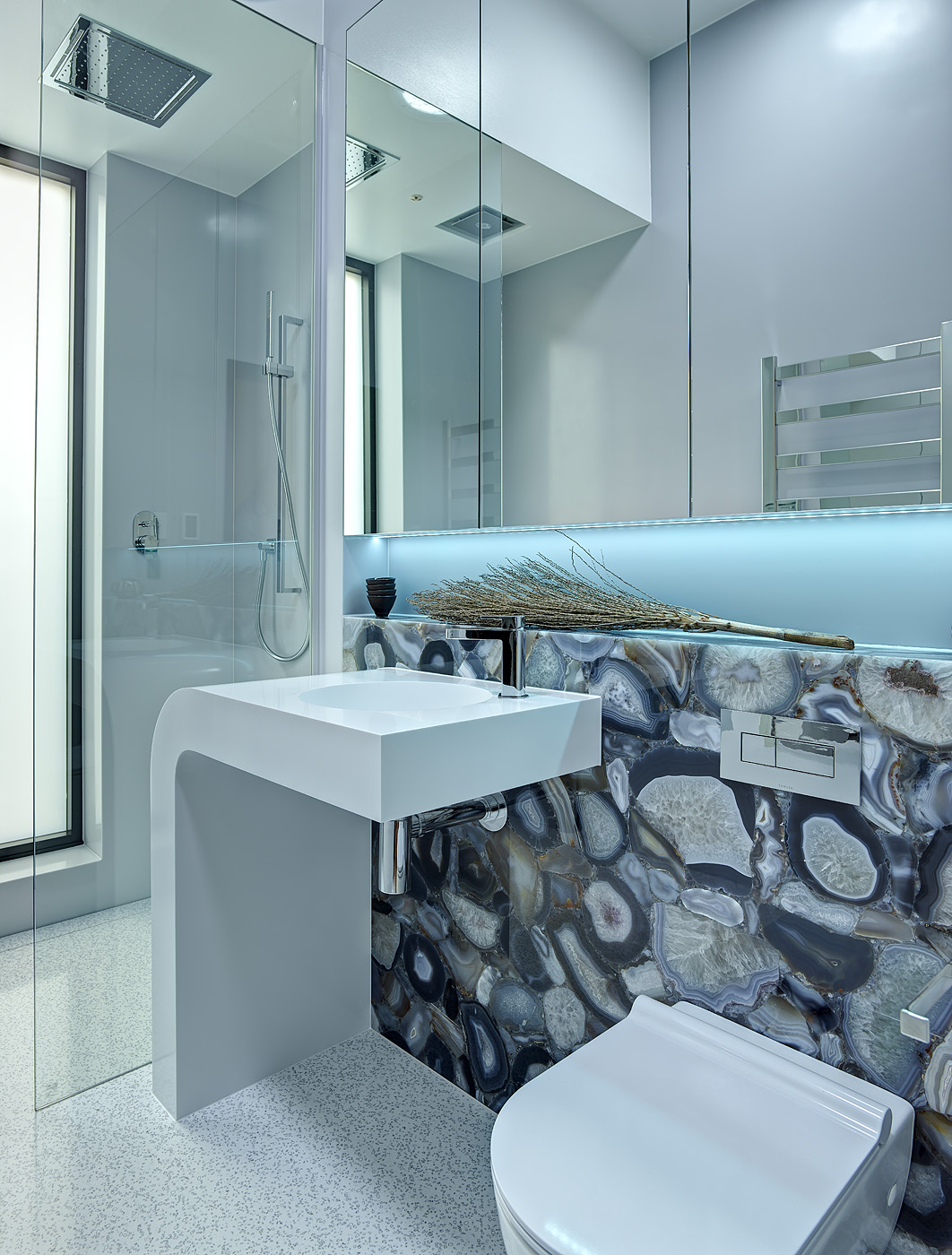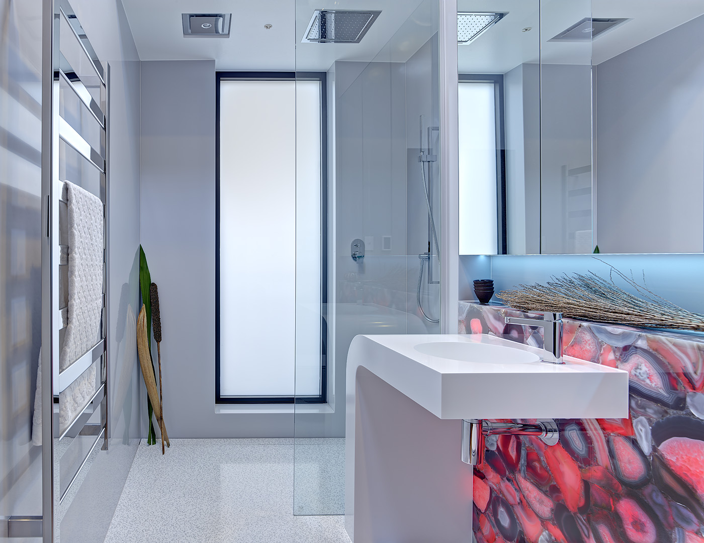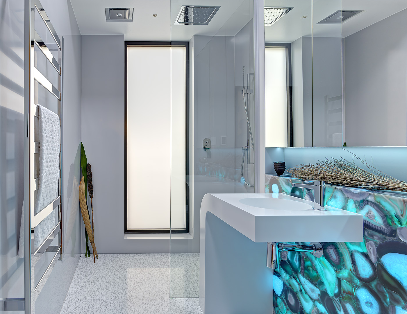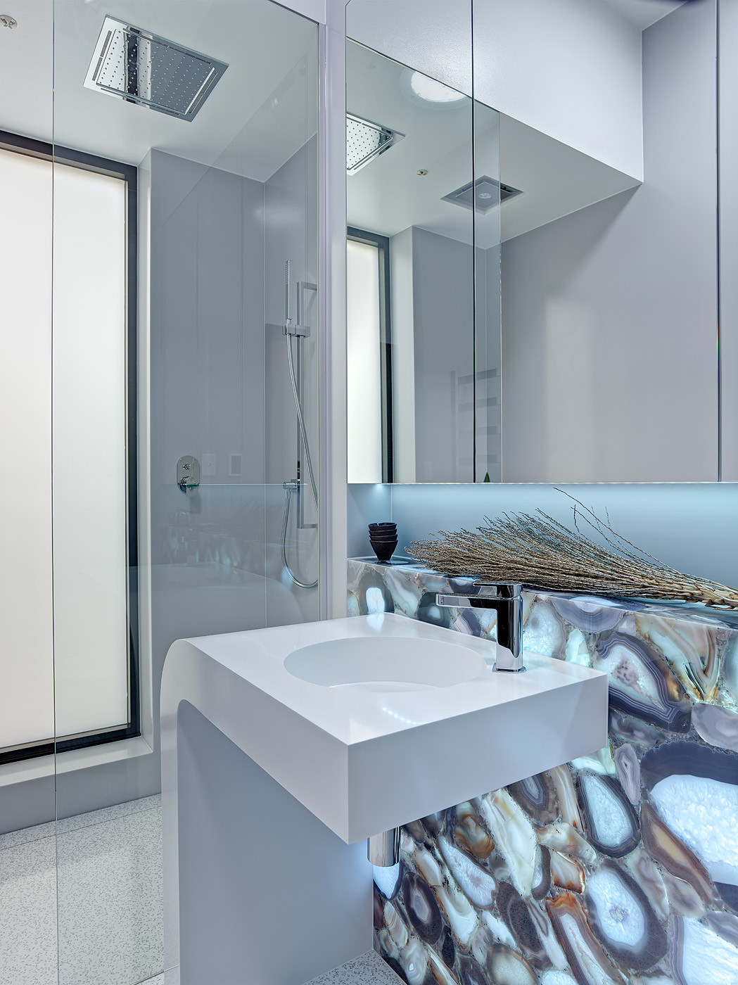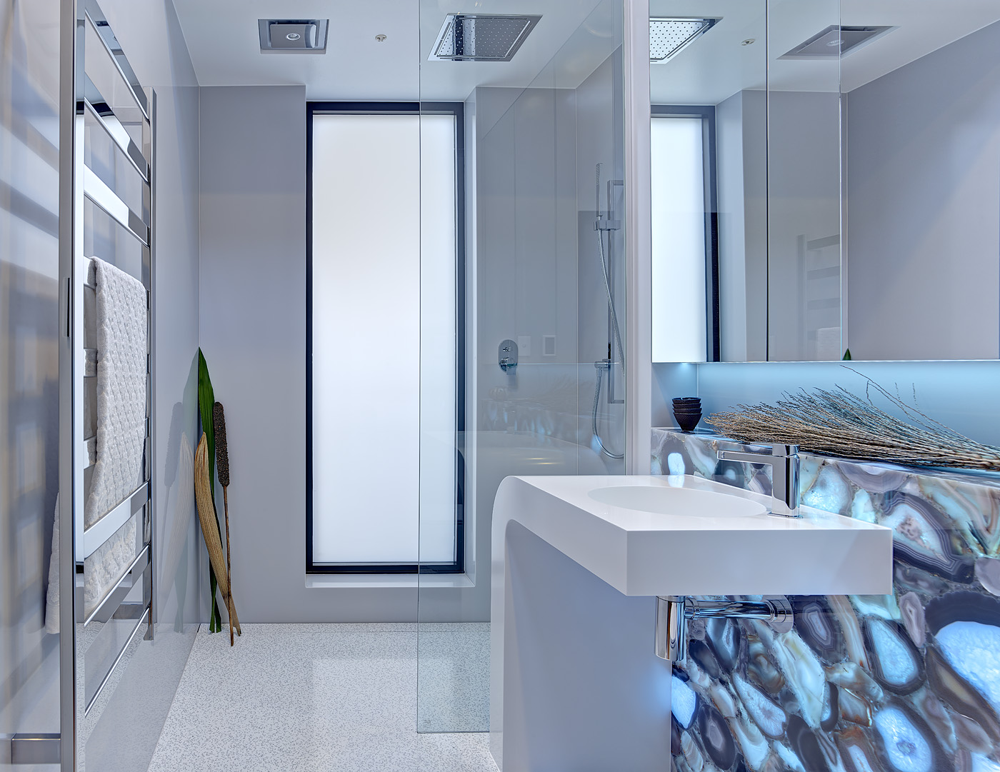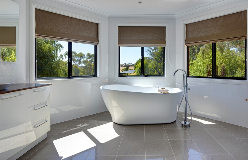 “The Renovation consisted of two upstairs bathrooms, a ground floor kitchen, laundry and powder room and over 200 square metres of new tiled flooring. Stunning polished porcelain tiles complement the existing grand staircase. This kitchen was extensively renovated, the focus being on increasing storage space and improving usability. The bulky corner pantry was removed and the bulkheads reworked and streamlined to suit the look of the new kitchen. The upstairs ensuite bathroom is a signature room of the project. This 15 square metre room features stylish angles windows, a free standing bath and a large, open walk in shower.”